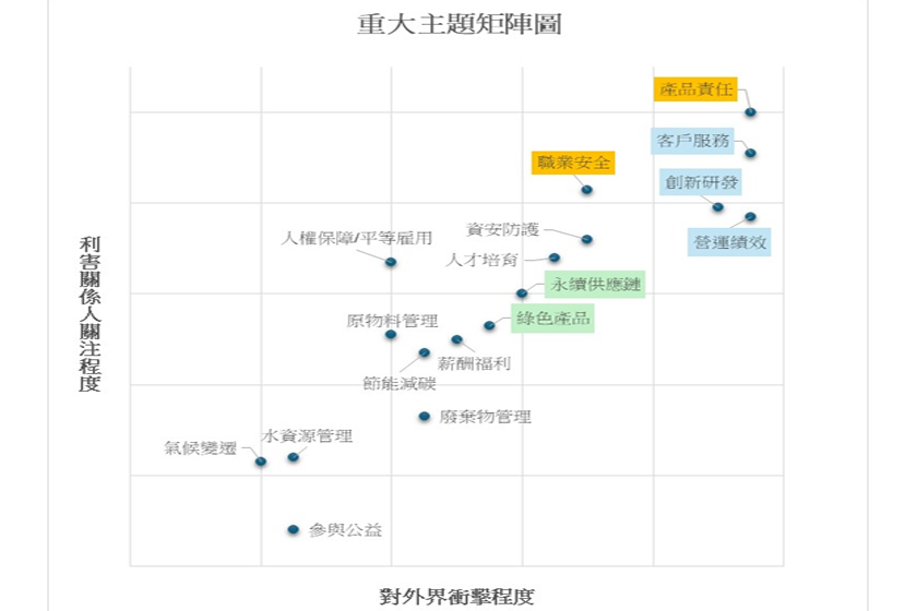 • 2024年度重大主題為「產品責任」、「客戶服務」、「營運績效」、「創新研發」、「職業安全」、「永續供應鏈」及「綠色產品」等七項議題。