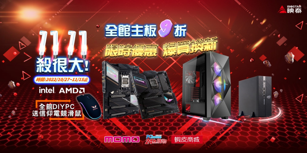 限時優惠 爆買換新 2022年10月27日,台北,台灣 – 高階主機板、電競與電腦周邊設備國際大廠BIOSTAR映泰,狂慶雙11年終盛典,全館9折優惠強勢來襲! 即日起在三大電商平台PChome 24H/momo購物網/蝦皮官方旗艦館,BIOSTAR推出主機板9折的優惠以及買DIYPC即送VALKYRIE系列RGB電競滑鼠。超級優惠時刻,想換機或換板子的消費者們千萬不要錯 ...