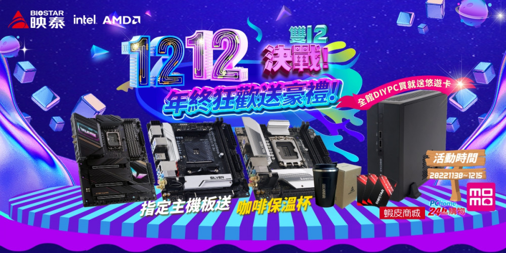 年終狂歡送豪禮 2022年11月30日, 台灣, 台北 - 高階主機板、電競與電腦周邊設備國際大廠BIOSTAR映泰,宣布雙12年終購物狂歡慶,超優質好禮大FUN送活動今日正式開跑! BIOSTAR針對1212瘋購物節,搶先一波推出買指定Z790/B660/B550系列主機板就送CP值超高的保溫/保冷咖啡杯,以及全館買DIYPC就送限量BIOSTAR悠遊卡, ...