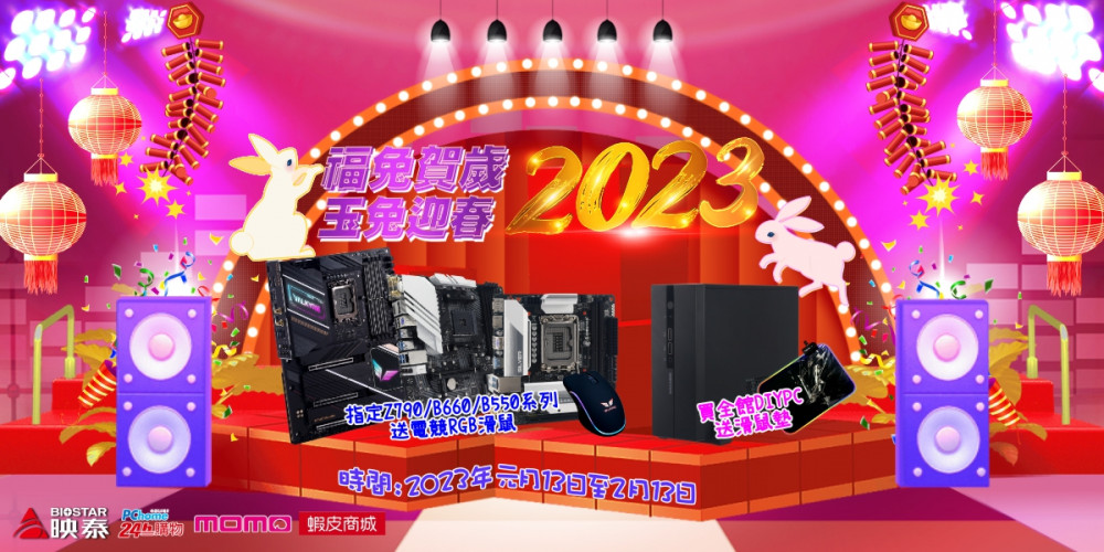 歡慶新年迎春 買即送限量信仰禮 2023年1月13日, 台灣, 台北 - 高階主機板、電競與電腦周邊設備國際大廠BIOSTAR映泰,在今日宣布2023新春活動開跑!即日起至PCHome 24H/momo/蝦皮電商平台買指定Z790/B660/B550系列主機板,就送信仰電競RGB滑鼠,買全館DIYPC就送BIOSTAR RGB鼠墊(M),數量有限,送完為止。 ...