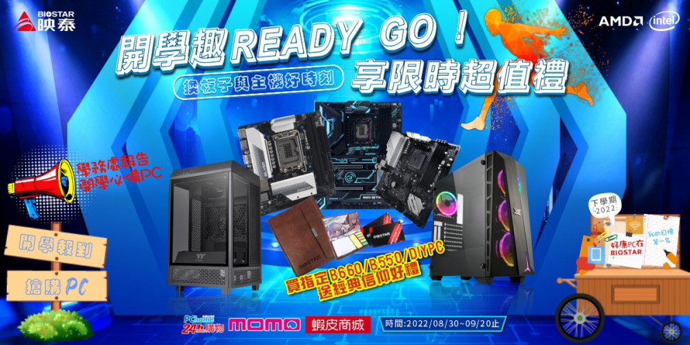 換板子與主機好時刻 2022年8月30日, 台灣, 台北 - 高階主機板、電競與電腦周邊設備國際大廠BIOSTAR 映泰,在今日宣布電商三大平台9月開學季活動開跑囉~享限時超值禮! 在秋分時刻,九月開學迎新季BIOSTAR特別推出限時超值禮活動,活動期間購買B660/B550晶片組主機板,就送限量信仰皮革筆記本!以及在映泰旗下三大電商平台(momo/Shop ...