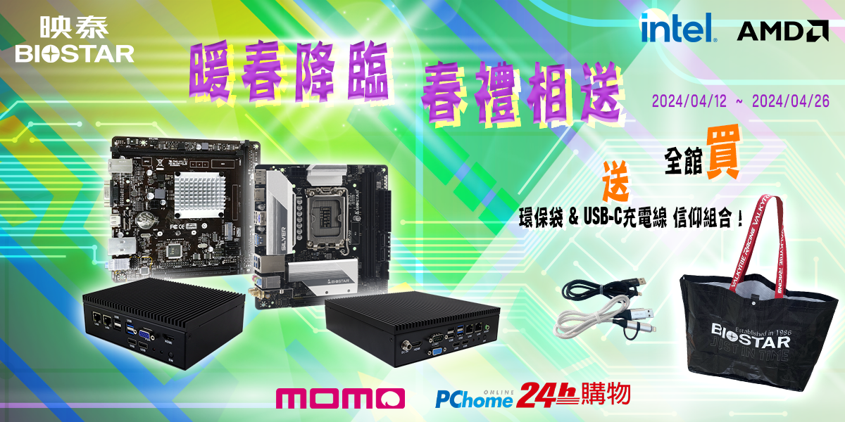 全館買就送限量信仰組 2024年4月12日, 台灣, 台北 - 高階主機板、電競與電腦周邊設備國際大廠BIOSTAR映泰,在今日宣布暖春好禮大放送活動開跑囉!即日起至PChome 24h/momo購物網電商平台,全館買BIOSTAR映泰主機板和應用系統電腦,就送USB -C充電線和實用的環保袋,BIOSTAR映泰推出好禮大放送跟星粉們一起享受暖風徐徐的春天。除了全館買就送好禮活動外, ...