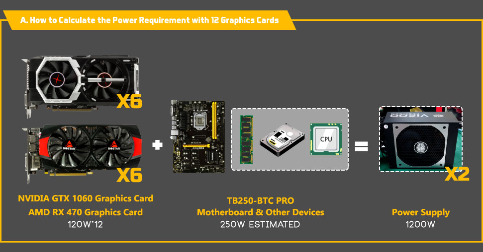 * If you are going to optionally install 6 pieces of AMD RX 470 graphics cards at the same time, you must estimate the maximum power consumption from all the devices of your crypto mining machine. The power supply should be at least 1200W, offering the power to six graphics cards, motherboard, CPU, memory, and other components.