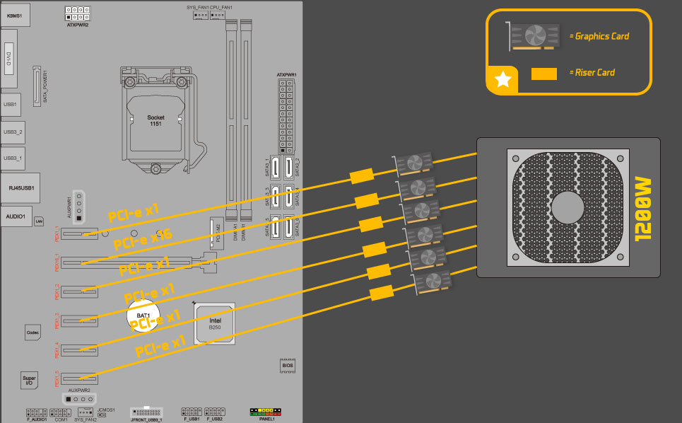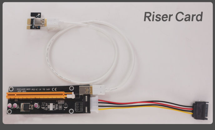 Connect the riser card with PCI-e X16 graphics card and the other five riser cards with PCI-e X1 graphics cards to the power supply.