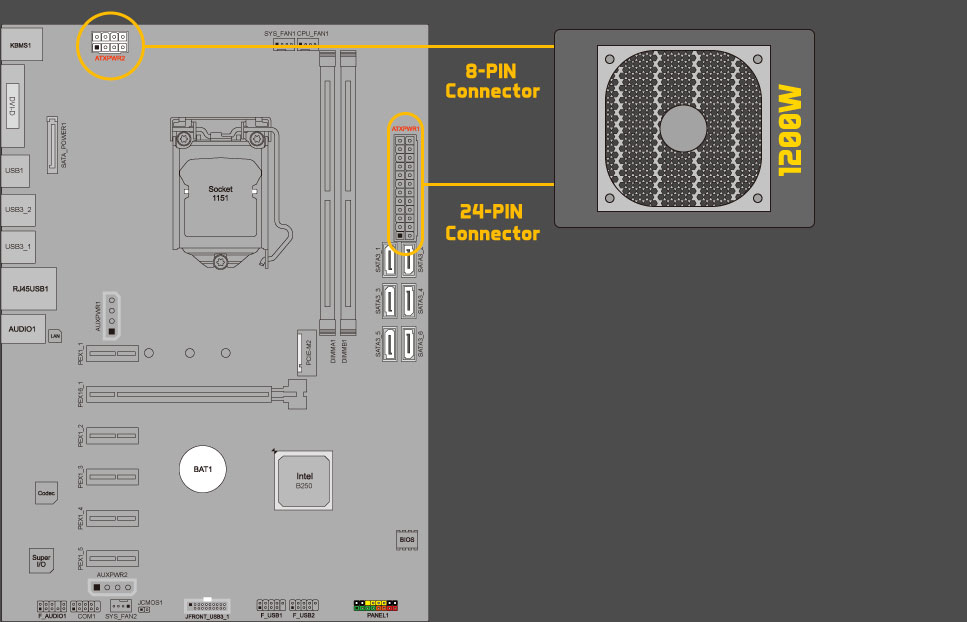 Connect 8-pin power connector and 24-pin power connector to the power supply.