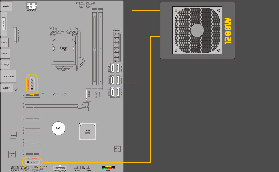 Connect 4-pin 12V AUXPWR 1 and 4-pin 12V AUXPWR 2 to the power supply.