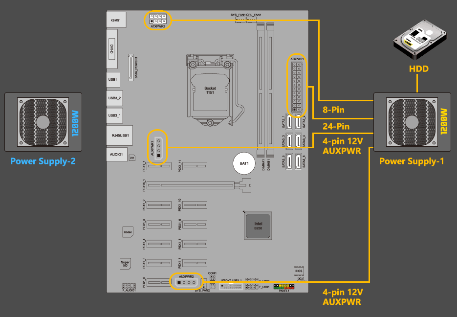 Connect 4-pin 12V AUXPWR 1 and 4-pin 12V AUXPWR 2 to the power supply-1. Also, connect SATA cable to HDD or SSD.