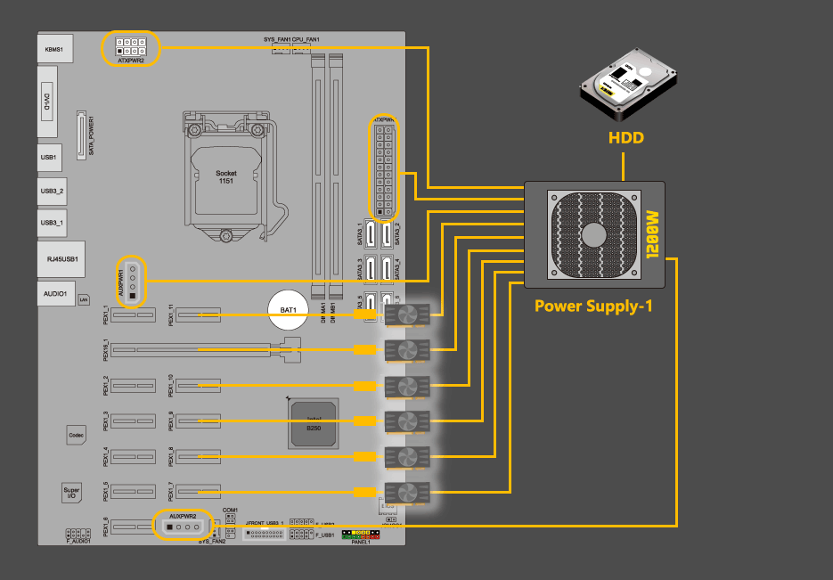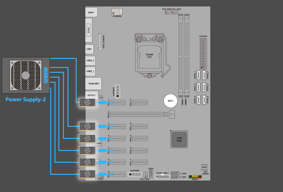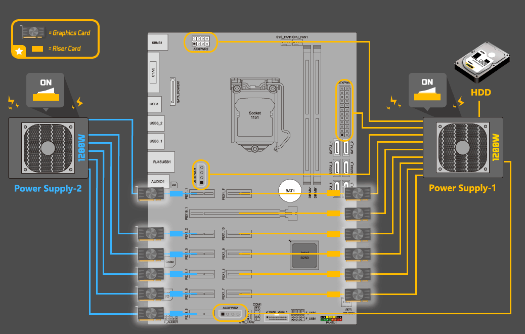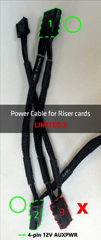 *Each power cable from power supply is limited to be connected to 2 graphics cards or 2 PCI-Ex16 riser cards.