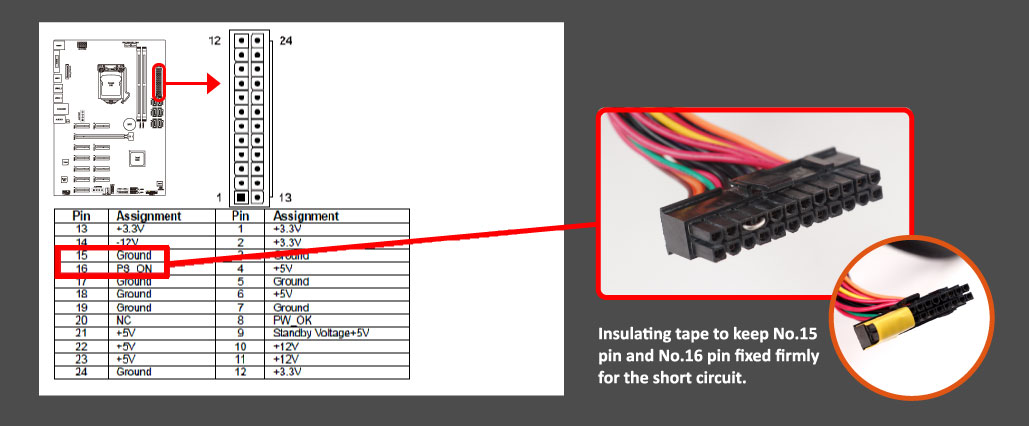 Follow the instruction below to establish a short circuit between No. 15 pin and No.16 pin on the 24-pin power connector of Power Supply 2.